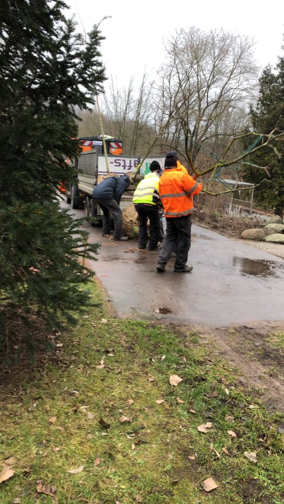 Nachdem am Vortag das Pflanzloch vorbereitet wurde, kam der Baum am Freitagmorgen bereits kurz nach 8 Uhr mit dem Transporter an. Mit vereinten Kräften und der nötigen Vorsicht wurde der Baum an seinen neuen Standort verbracht. Er steht jetzt ganz in der Nähe der Kräuterschnecke.